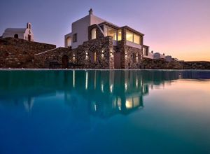 Σε ένα από τα πλέον προνομιακά και αριστοκρατικά σημεία του Ορνού Μυκόνου, αυτή η εξαιρετική πέτρινη βίλα των 200 τ.μ. δεσπόζει σε οικόπεδο 1.400 τ.μ.